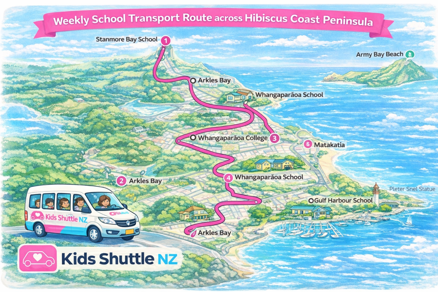 This map shows our established weekly school transport route across the Hibiscus Coast peninsula. Schools are grouped by area and finish times to keep journeys calm, predictable, and efficient.